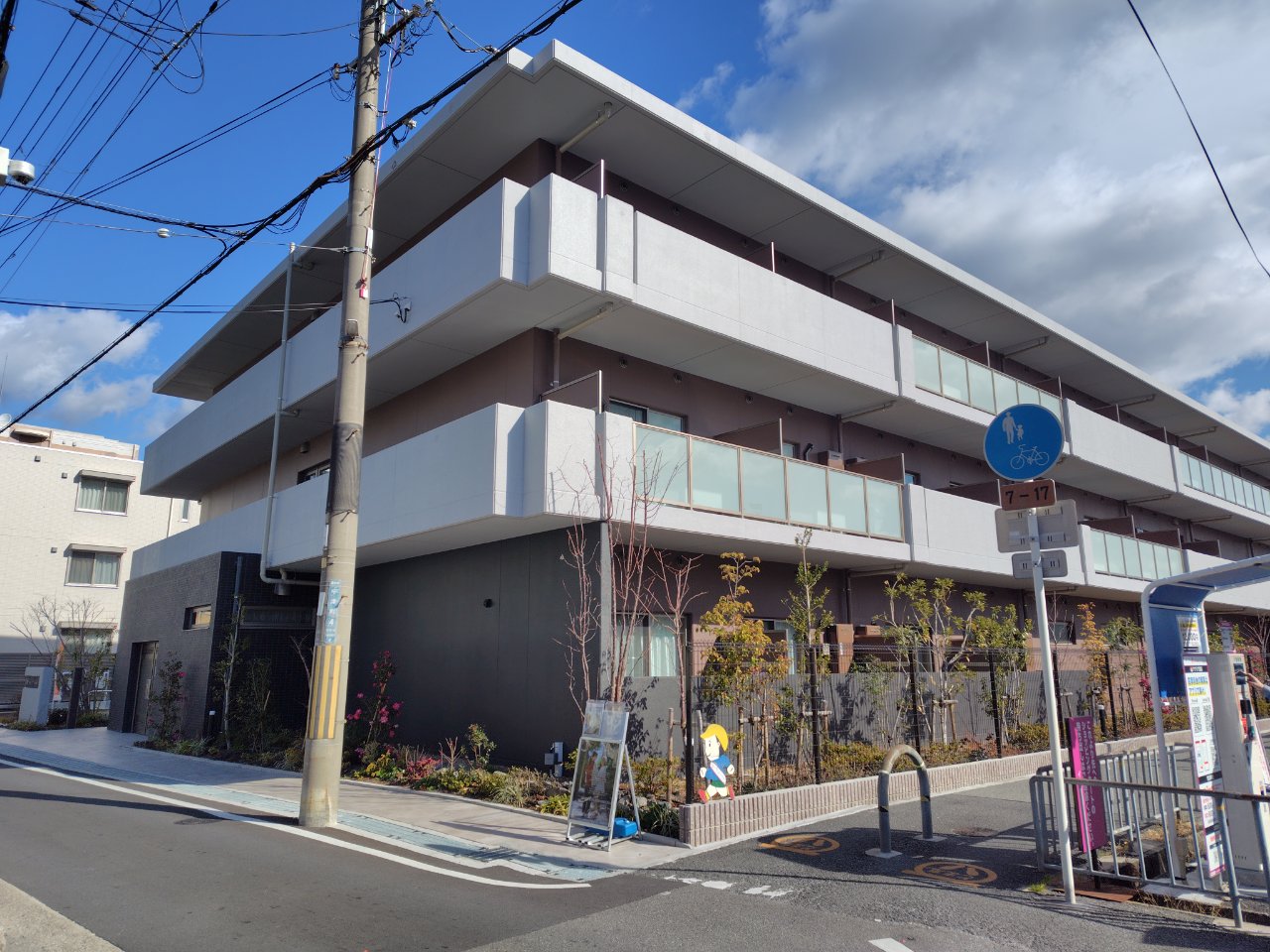 駅前の賑やかな繁華街を抜けたイオンの駐車場跡地に2025年9月に開設されたサ高住。南側が開け、明るく見通しの良い場所に立地している。
