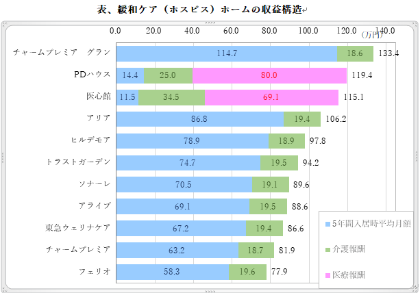 有料老人ホームの入居者1人当たり月額売上高を高額順に並べるとPDハウス・医心館は高級高額ホームに相当し、一方月額費用(家賃食費など)は14.4万11.5万と他ホームと比べ異常に安い設定となっている。その不足額を医療報酬で賄っている構造がわかる。