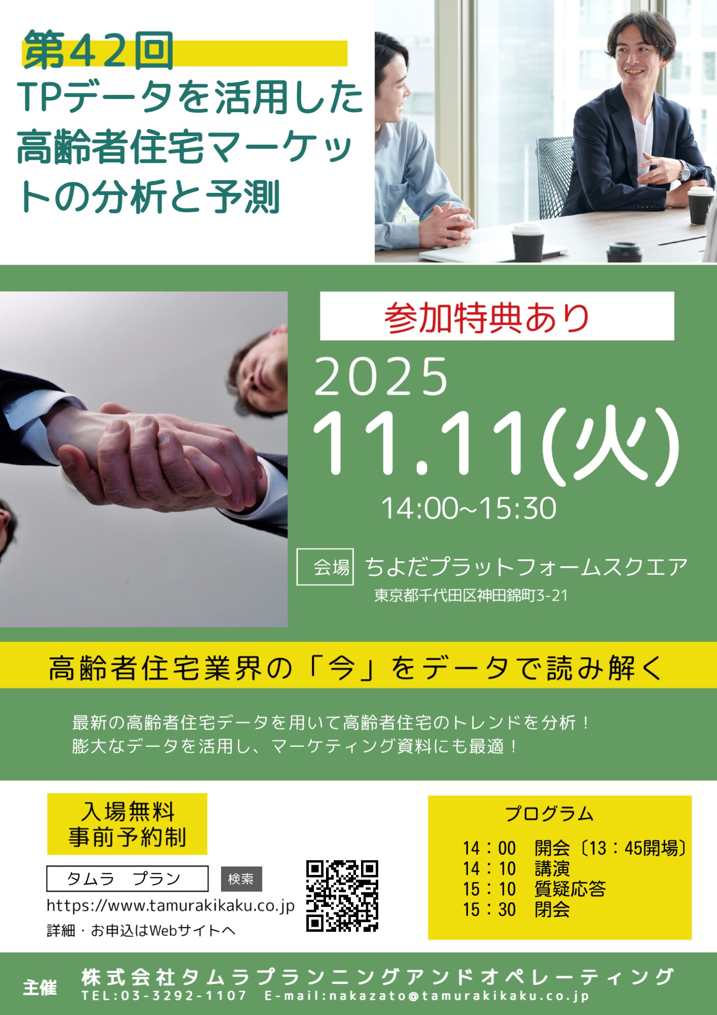 セミナーの趣旨・内容 | 高齢者住宅・居宅サービスのデータベースとコンサルティングを提供するタムラプランニングアンドオペレーティングでは、10月末に、TPデータ・サービス「高齢者住宅データ」2025年度下半期号を発行します。 当社では、これを受けまして、「高齢者住宅データ」の最新データを元に、高齢者住宅業界の最新動向を解説するセミナーを開催します。 |