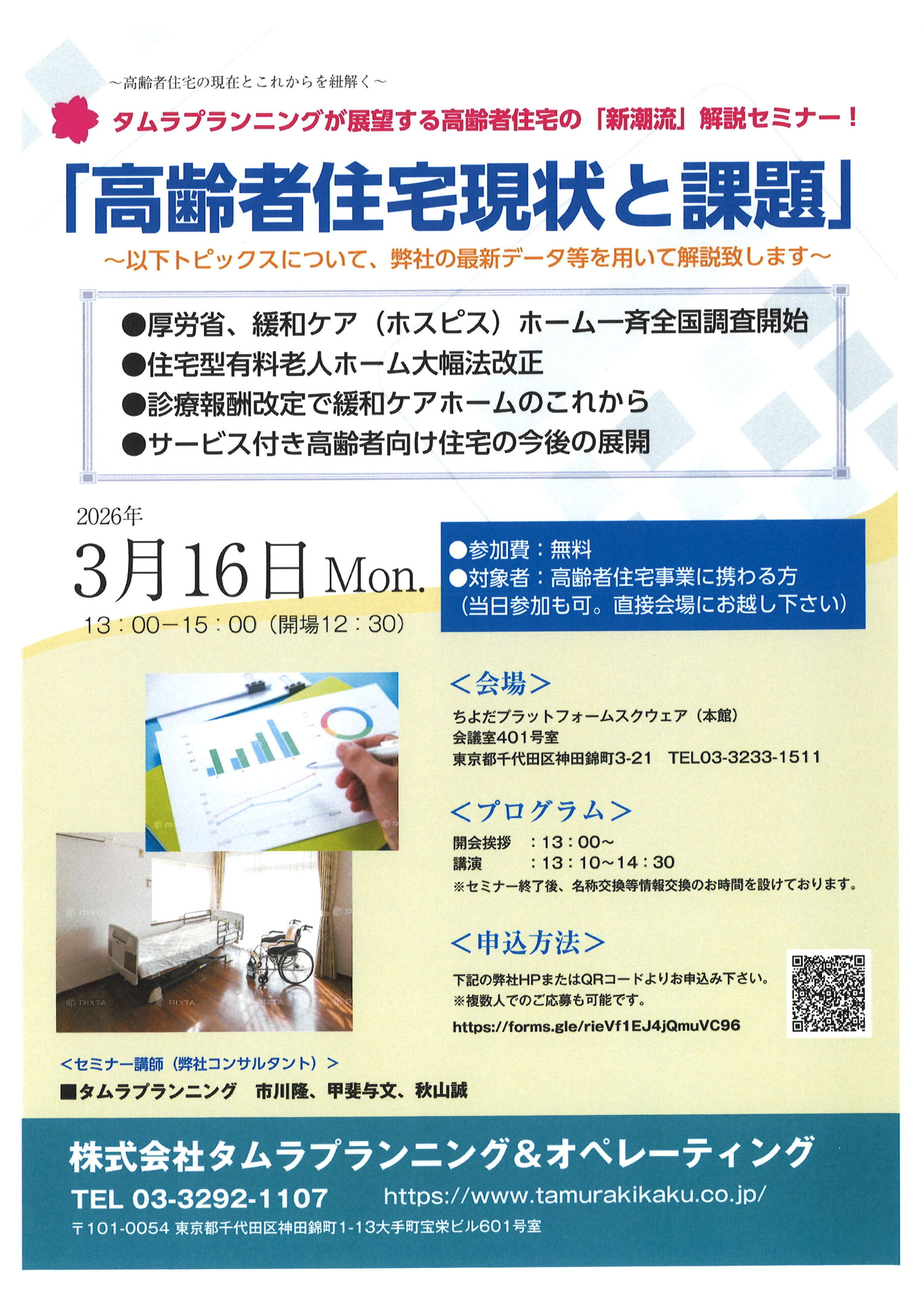 | セミナーの趣旨・内容 | さて、弊社では、2026年3月16日(月)に高齢者住宅事業に携わる方々に向けたセミナー「高齢者住宅現状と課題」を開催いたします。 |