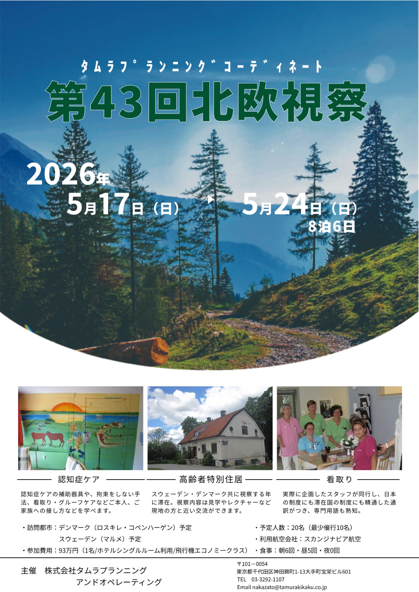 | 趣旨・内容 | 昨年復活した北欧視察。今年も5月に開催致します。スウェーデン・デンマークの都市に滞在し、認知症ケア・ターミナルケアの手法や、補助器具/ICTの利用など福祉先進国の「今」を見て学びましょう! イラン情勢もあり渡航費用が高騰したままですので、参加費用、募集形態も以前とは変更しております。お申し込み後予約になりますので、まずは参加のご意思をご連絡いただければと思います。 利用航空機(スカンジナビア航空)が羽田発着に変更、集合解散場所も羽田となり、都心から近くなりました。 実際に高齢者の住む住宅を訪問し、施策や制度を学ぶ企画で、過去には介護職、看護職、食事栄養関連に携わるスタッフも多く参加いただいています。現場の空気感を感じ、体験することで認知症ケア、ターミナルケアの考え方を学べ、国は違えども専門職であることで共感する部分も多く感じていただけると思います。更に日本からの他の参加者との意見交換等も出来、すぐに現場に活かしていただけるよう企画しておりますので、現場の改善や質の向上、自身のスキルアップをお考えの方は是非ともお問い合わせ下さい。 視察には専門用語のわかる通訳が同行しますので、英語力は必要としませんのでご安心ください。 |
